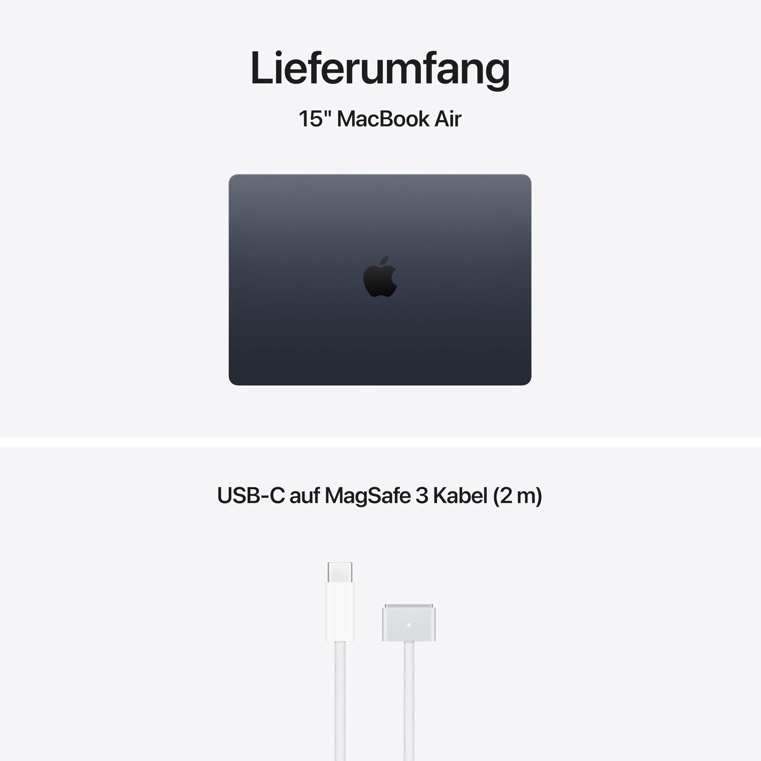 MacBook Air z barvo Midnight je idealen za vse, ki želijo zmogljiv, tanek in lahek prenosnik s prednjim tehnološkim znanjem. Vključena je USB-C na MagSafe 3 kabel; napajalni adapter (35W ali več) je potrebno kupiti posebej.