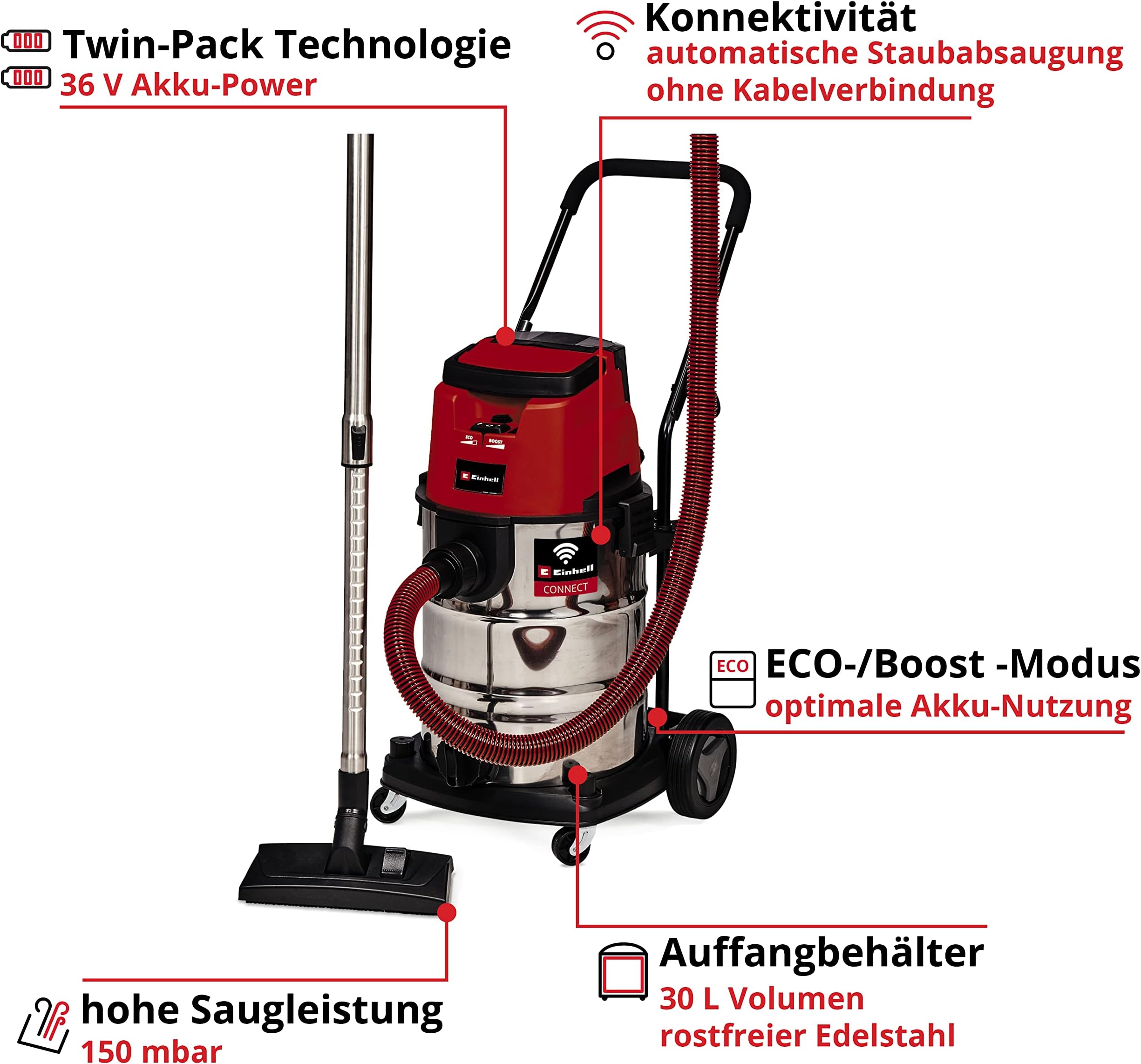Profesionalni akumulatorski sesalnik za suho in mokro čiščenje Einhell TP-VC 36/30 S Auto-Solo je idealna rešitev za zahtevna čiščenja v delavnici, garaži in domu. Ta zmogljiv sesalnik spada v ekosistem Power X-Change in omogoča fleksibilno kombiniranje akumulatorjev, polnilnikov in sistemskih naprav.