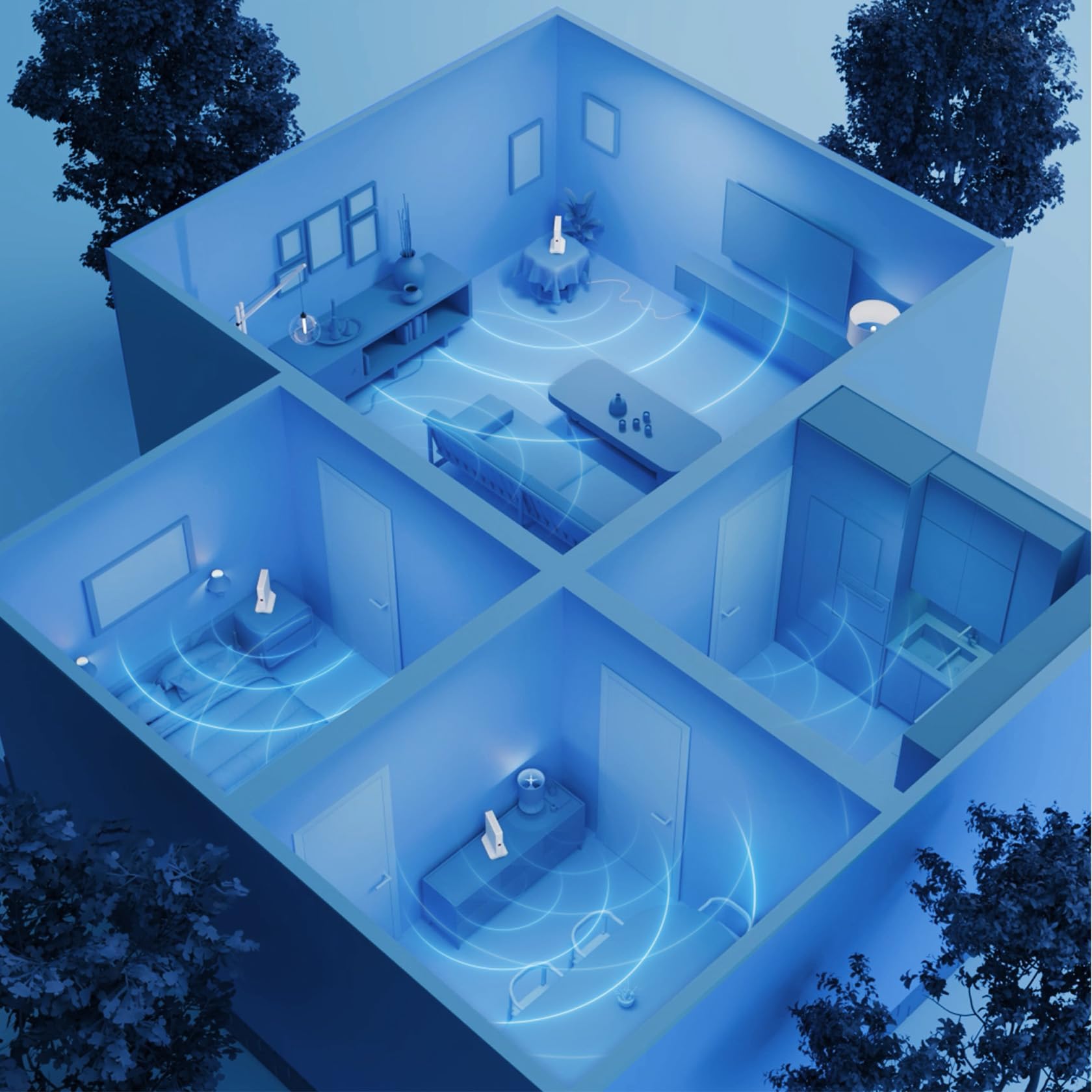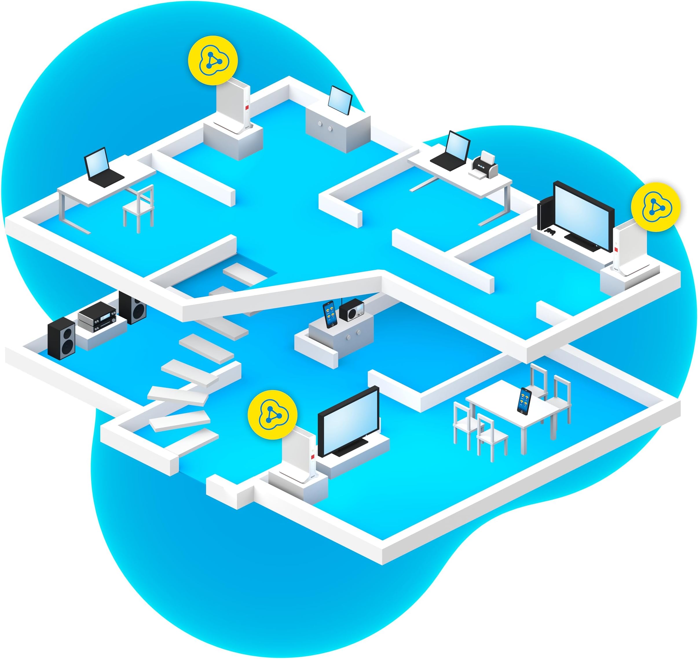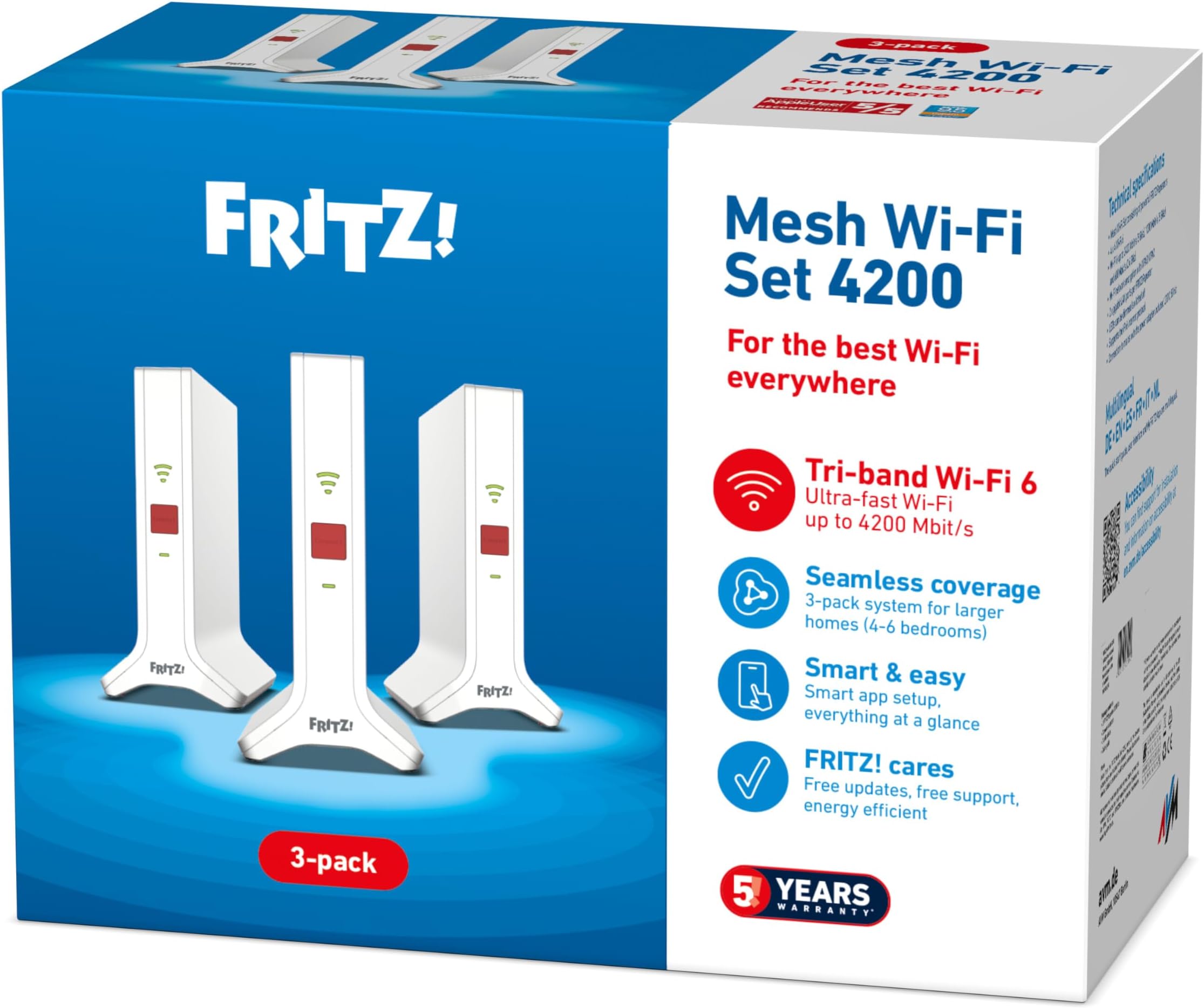 S FRITZ!Mesh Set 4200 boste uživali v hitrem, stabilnem in pokrajšanem Wi-Fi signalu po celotnem domu – idealna izbira za velika stanovanja in hiše.
