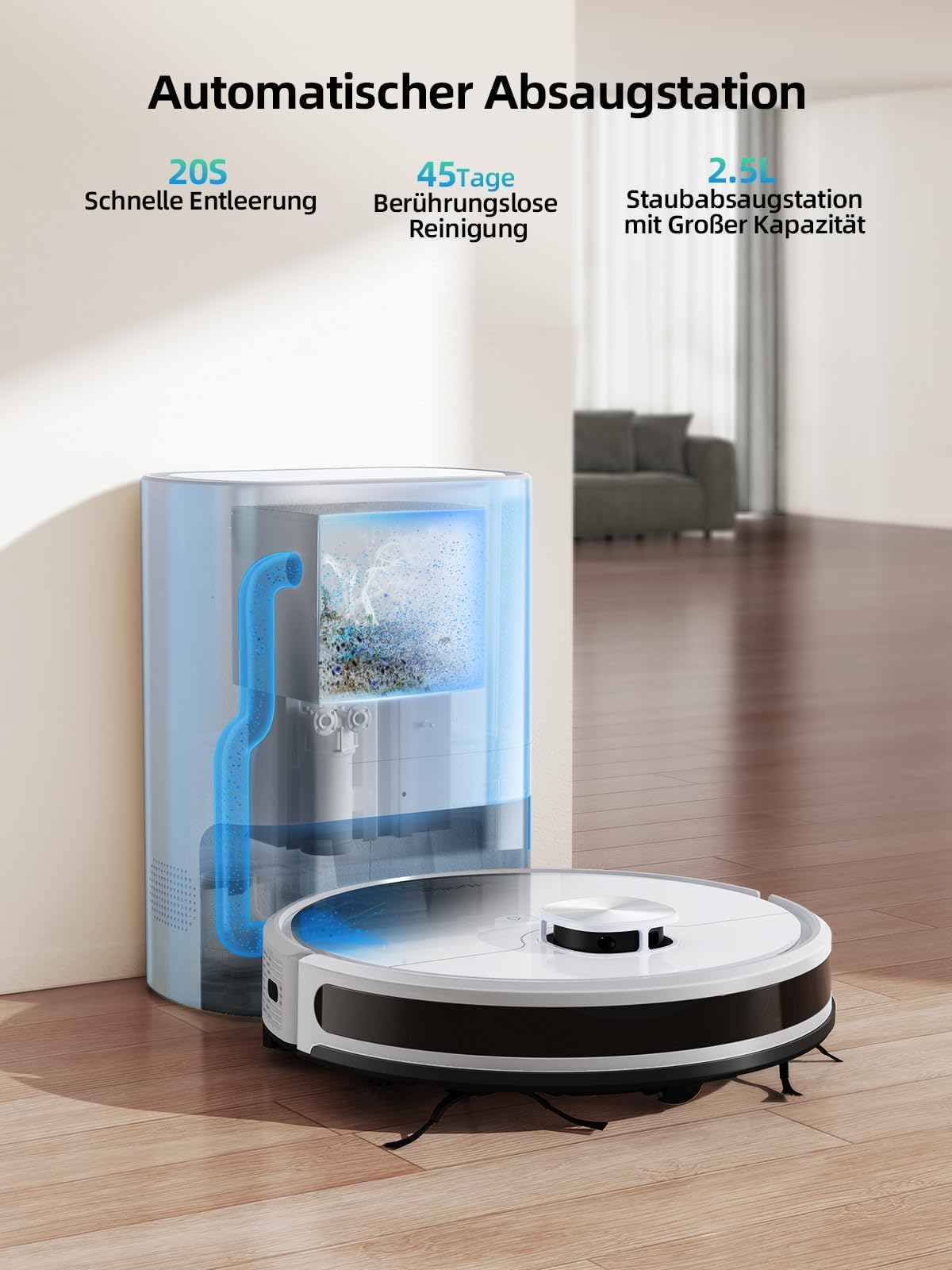 - Postaja za praznjenje s 60-dnevno zmogljivostjo – Robotski sesalnik se samodejno izprazni v 20 sekundah. Prašni rezervoar se polni le vsakih 60 dni, zato vam ni treba skrbeti za pogosto praznjenje