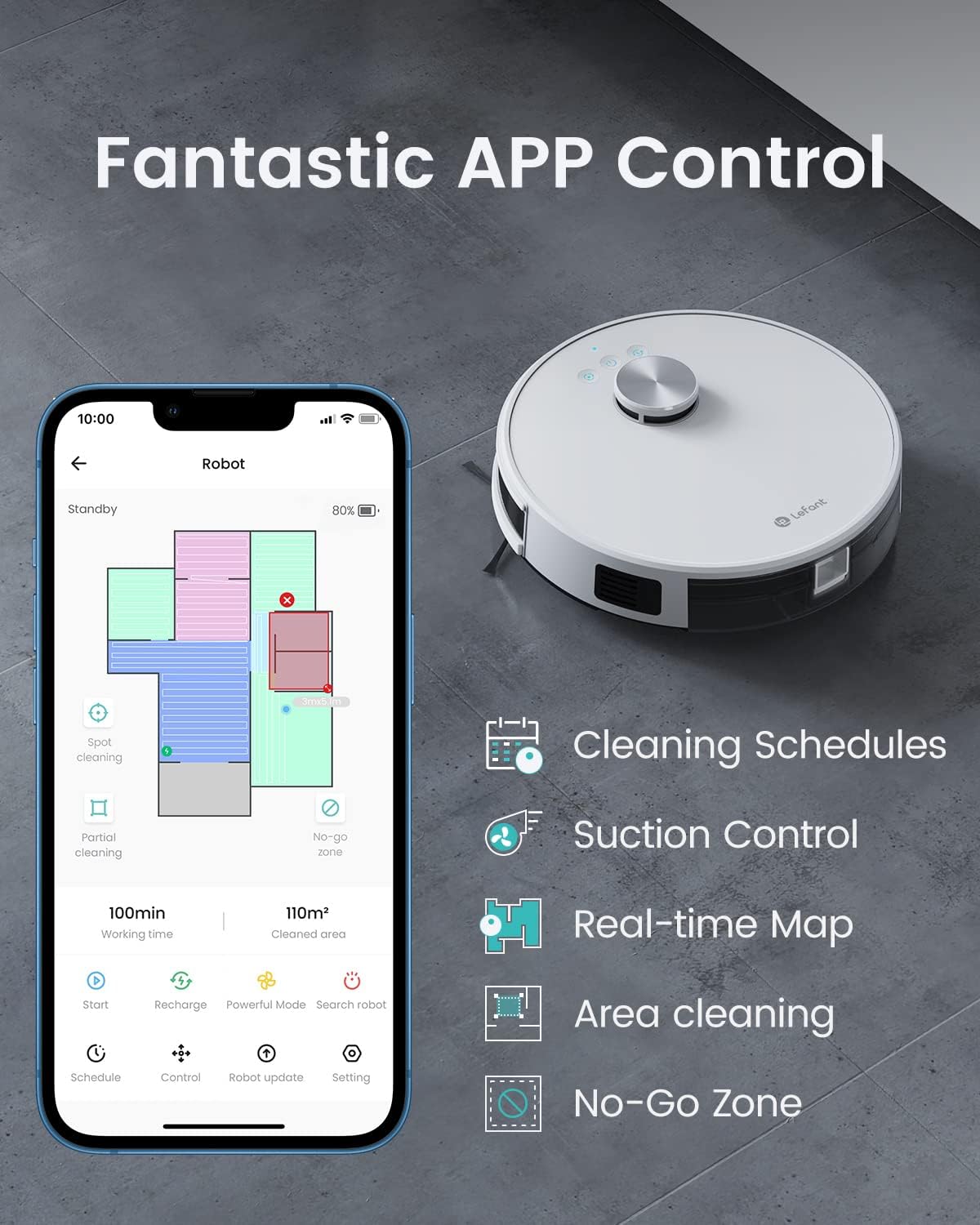 - Pametno upravljanje: Aplikacija in glasovna kontrola Alexa omogočata prilagajanje sesalne moči, količine vode in preverjanje stanja baterije kjerkoli in kadarkoli
