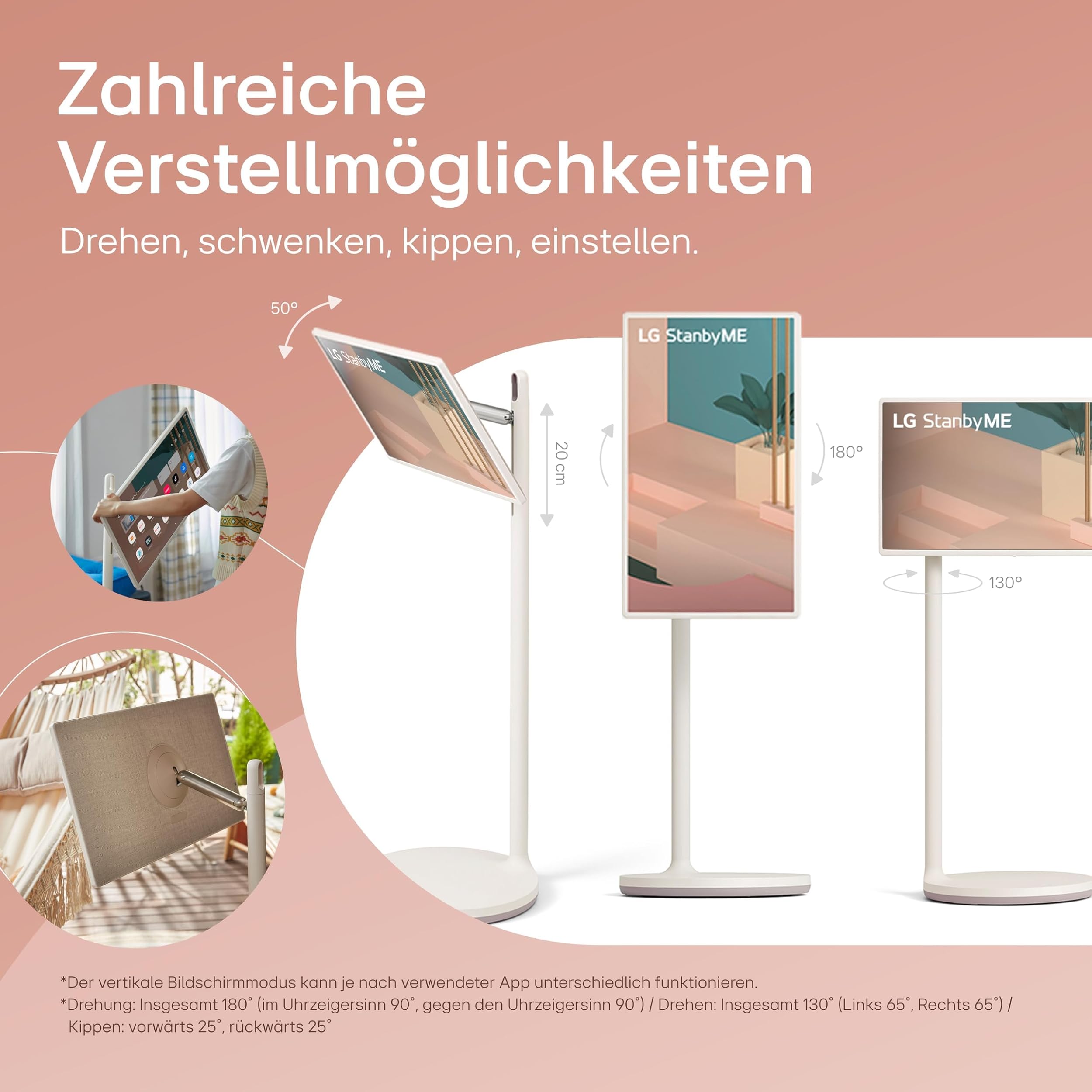 Odkrijte novo dimenzijo fleksibilnega gledanja s to inovativno 27-palčno lifestyle TV-jo od LG. StanbyME je idealna za tiste, ki želijo kakovostno zabavo povsod po domu – od spalnice do dnevne sobe. Eleganten bež dizajn se harmonično vklopi v vsako okolico, medtem ko vgrajena baterija omogoča do 3 ur neprekinjene uporabe brez priključka na električni tok.