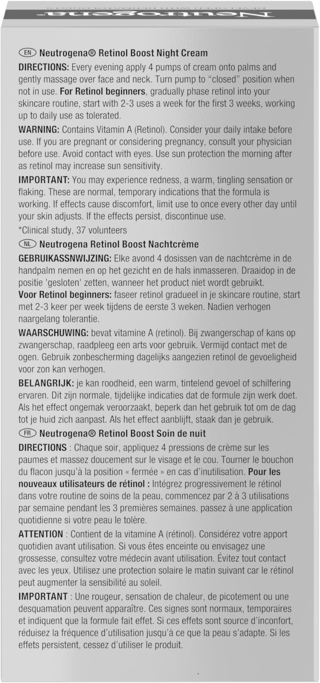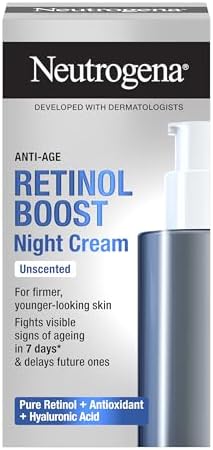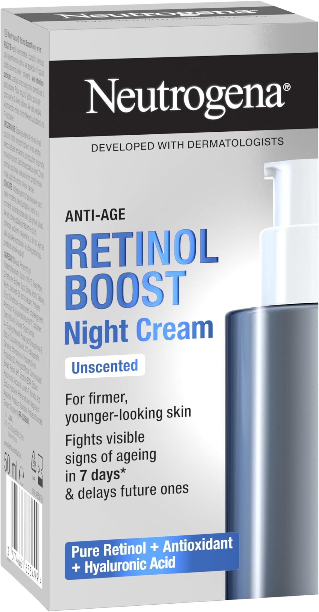 Neutrogena Retinol Boost Anti-Age Nachtcreme je nočna krema, ki je posebej oblikovana za regeneracijo in omlajšanje kože. Retinol, aktivna sestavina te kreme, je znana po svojih antiaging učinkih in spodbuja naravno prenovo kože med spanjem.