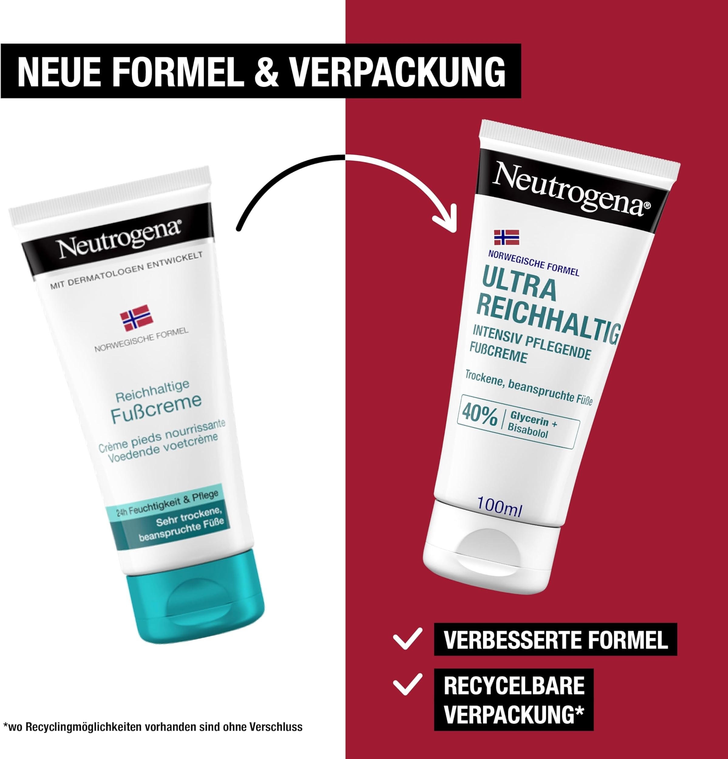 Neutrogena Ultra reichhaltige Fußcreme je intenzivna nega za suhe in obremenjene noge. S posebno norveško formulo, obogateno z 40 % glicerina in bisabololom, nudi 24-urno hidracijo in vidno izboljšanje že v 7 dneh. Krema hitro vdira, ne pušča mastnega filma in je primerna tudi za občutljivo kožo.