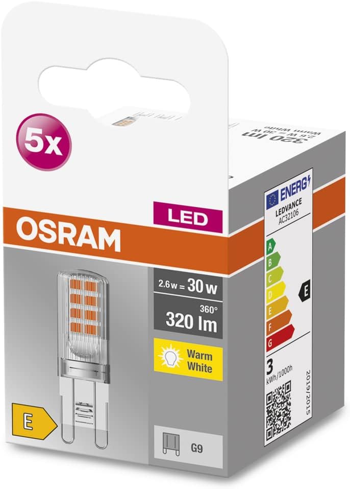 OSRAM Star PIN LED žarnica za gnezdo G9 je sodobna LED rešitev za vašo domačo razsvetljavo. Paket vsebuje 5 kosov visokokakovostnih LED žarnic, ki so idealne za zamenjavo tradicionalnih 30W žarnic. Z toplo belo svetlobo (2700K) ustvarite prijetno in sproščujočo atmosfero v dnevnih sobah, spalnicah in otroških sobah.