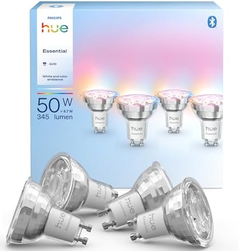 Pametne LED žarnice Philips Hue Essential so idealna izbira za tiste, ki želijo preobraziti svoje domače razsvetljavo. Ta 4-pack GU10 reflektorskih žarnic vam omogoča enostavno namestitev in takojšnjo kontrolo svetlobe preko pametnega telefona ali glasovnih asistentov.