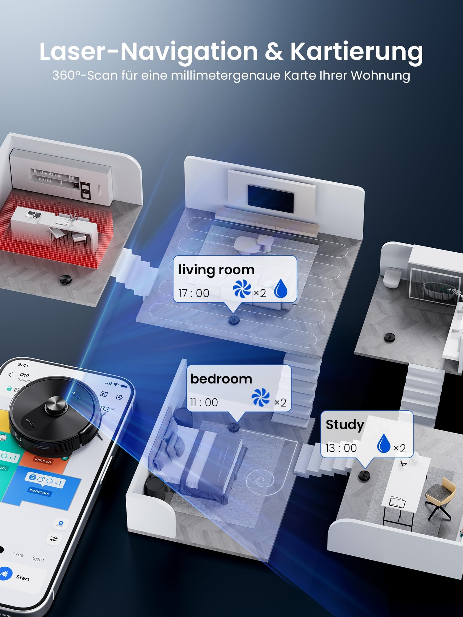 • Upravljanje 5 različnih načrtov čiščenja – Shranite do 5 različnih zemljevidov in prilagodite strategije čiščenja za vsako sobo. Nastavite izključne cone in razporejevalec čiščenja po urniku.