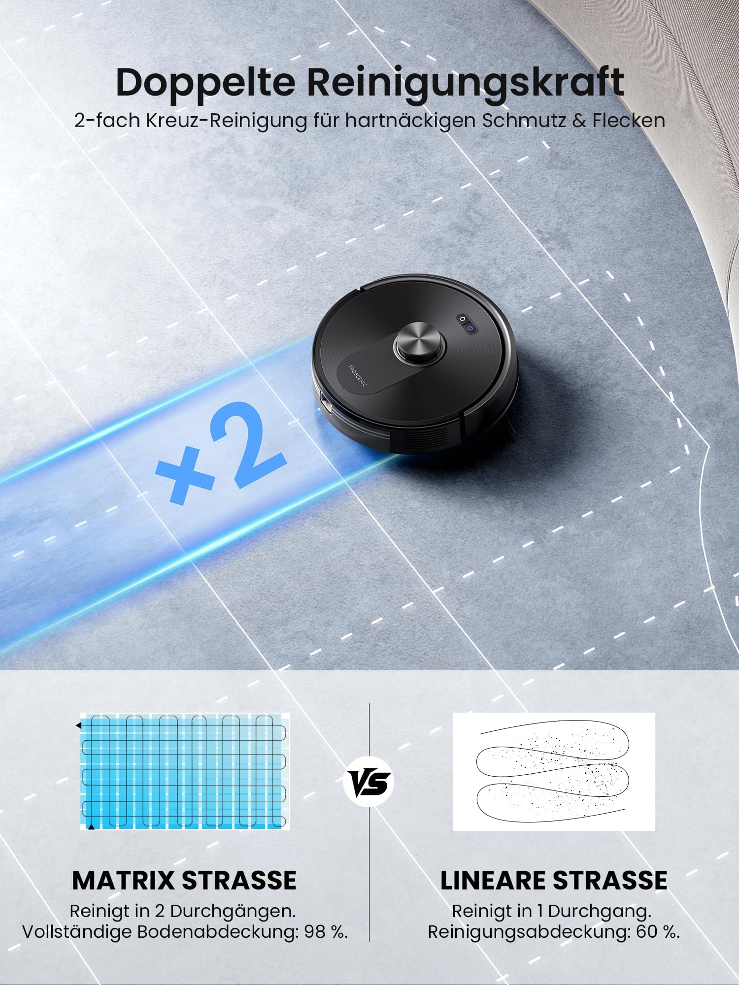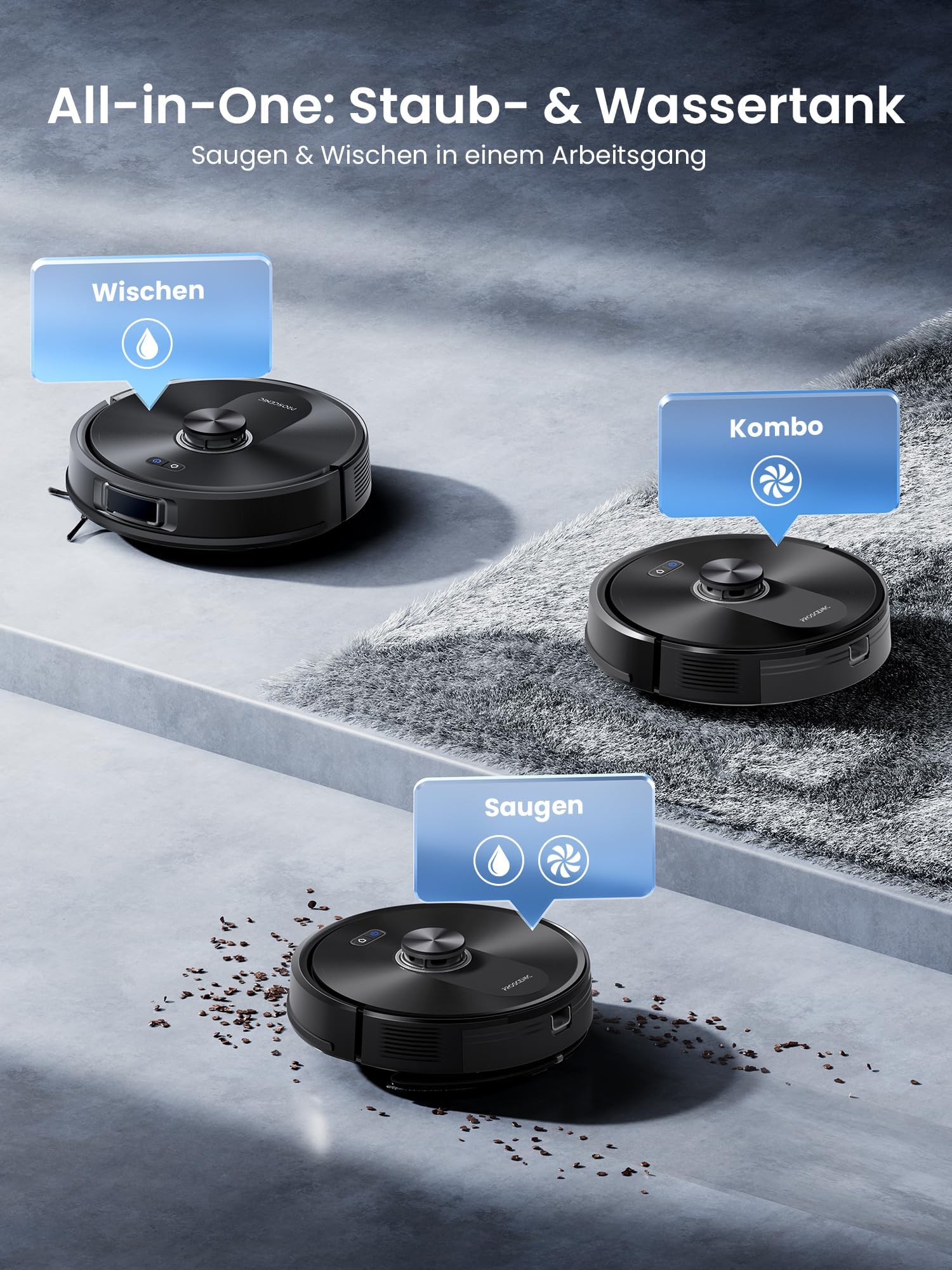 • 3-v-1 čiščenje: sesanje, mokro čiščenje ali oboje hkrati – Sesalnik lahko sesate, brišete ali počistite na oba načina sočasno. Tri nastavitve količine vode omogočajo prilagoditev različnim tipom tal. Matrična čiščenja zagotavlja temeljito čistočo brez madežev.