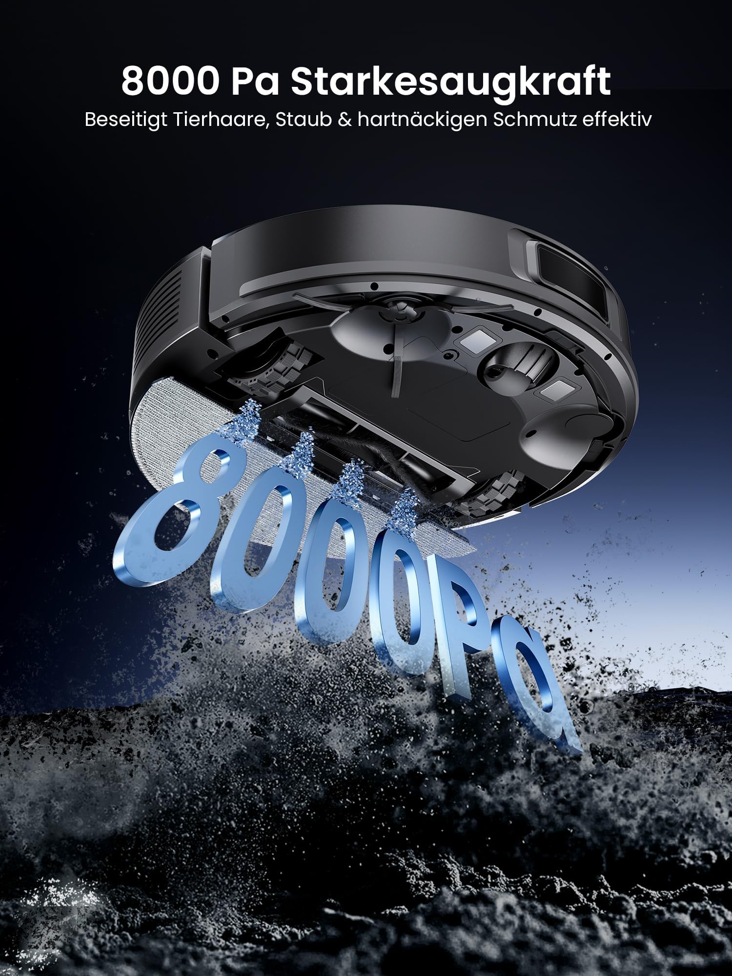 • Zmogljivo sesanje za lasuljo in prah – Motor z 8000 Pa sesalne moči in učinkovit filter zanesljivo odstranjujeta lasuljo hišnih ljubljenčkov, prah in alergene. Avtomatski senzor za prepoznavanje preprog samodejno poveča sesalno moč na mehkih površinah.