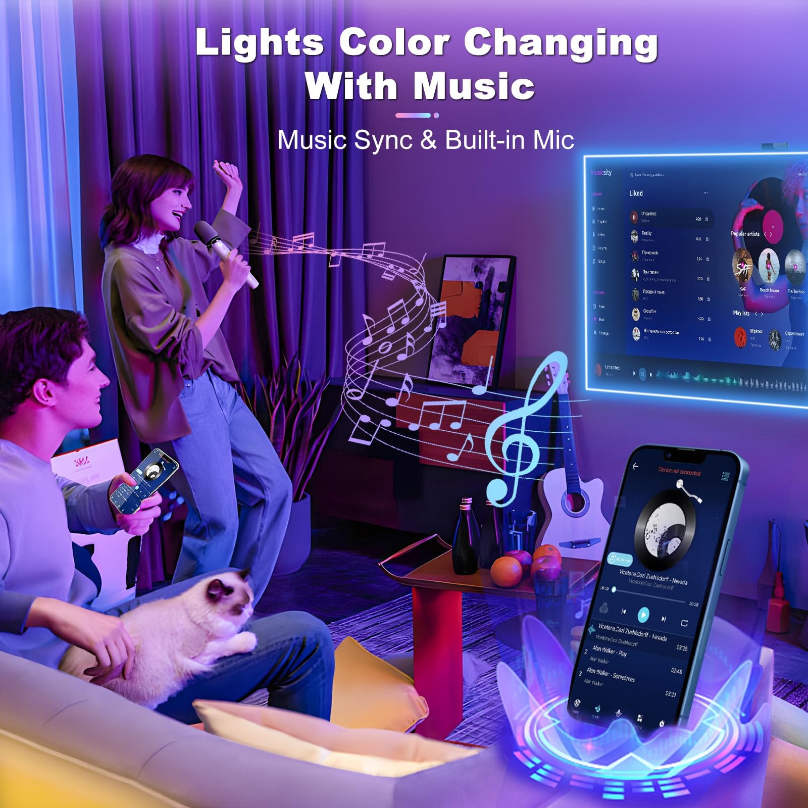- Sinhronizacija z glasbo: Vgrajena občutljiva mikrofona zazna glasbo iz telefona in okoljske zvoke. Barve, svetlost in ritmi se avtomatično prilagajajo glasbi – idealno za zabave in domače koncerte.