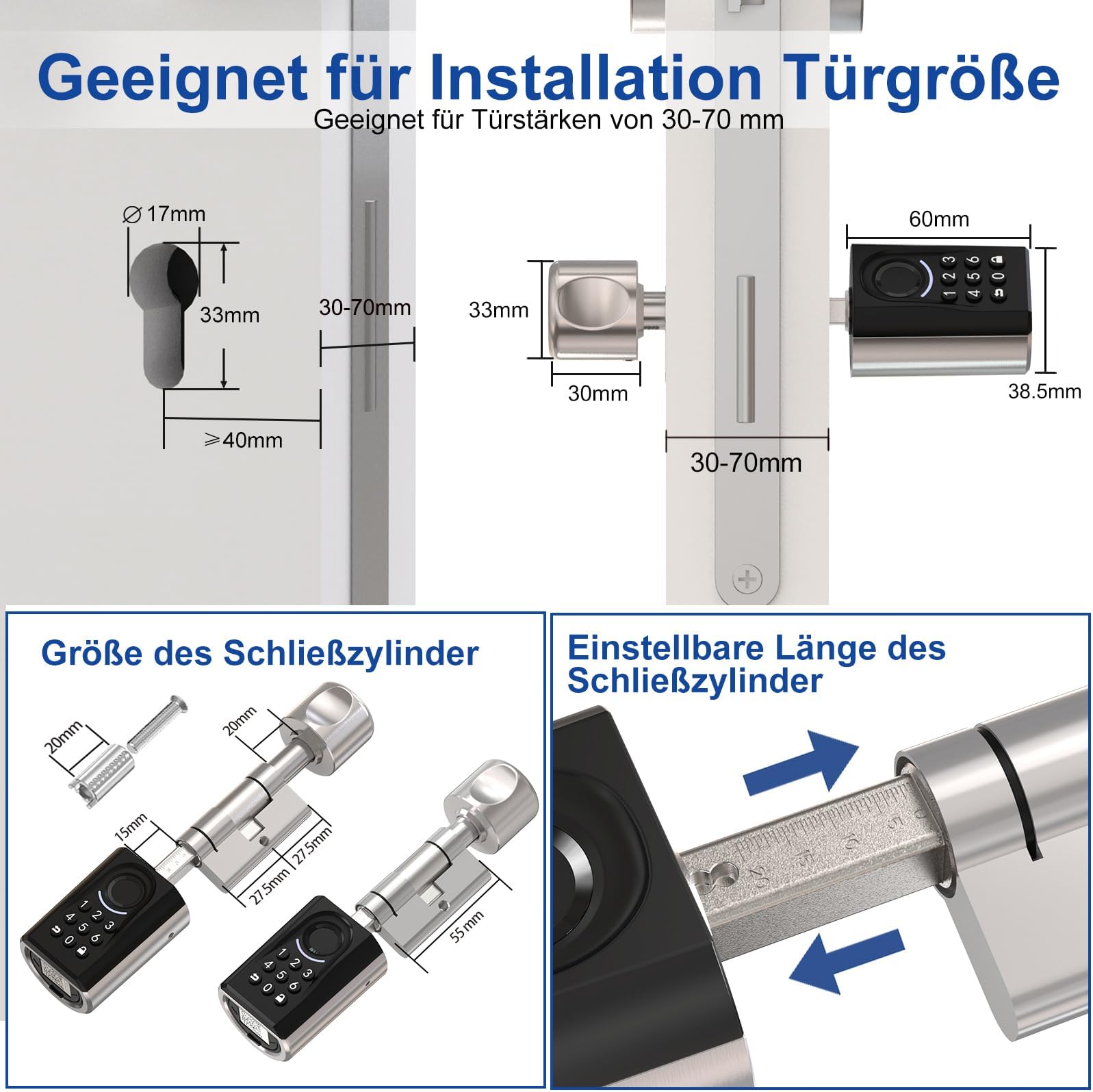 - Enostavna namestitev brez vrtalnika: zamenja le mehanski valj, brez potrebe po vrtanju ali polaganju kablov; primerna za vrata debeline 30–70 mm