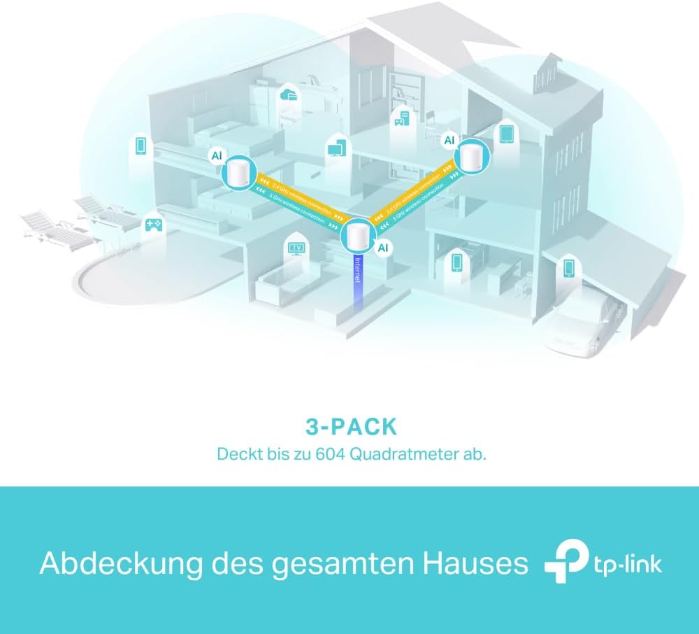 - Pokritost do 604 m² – Umetna inteligenca avtomatično optimizira mrežo in vas poveza z najbližjo enoto Deco za najboljšo hitrost