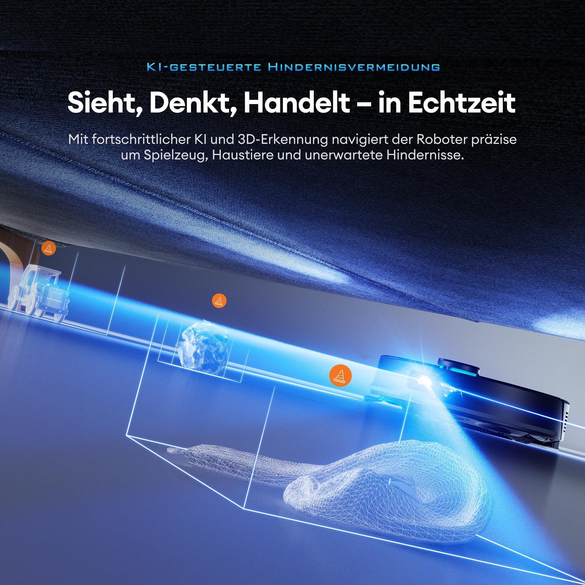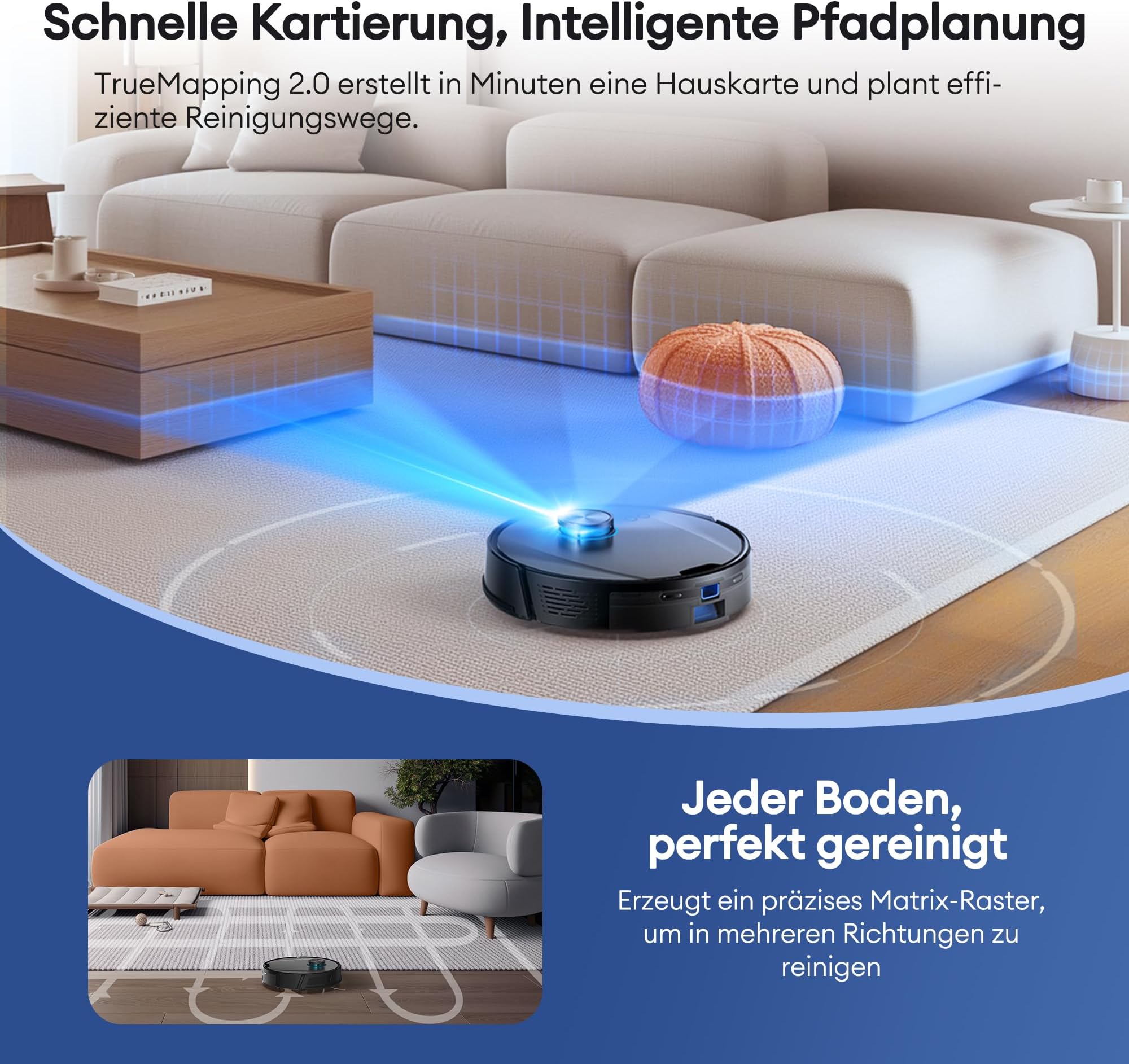- Pametna navigacija: 360° laserska navigacija z umetno inteligenco za natančno kartiranje prostorov in zanesljivo izogibanje oviram