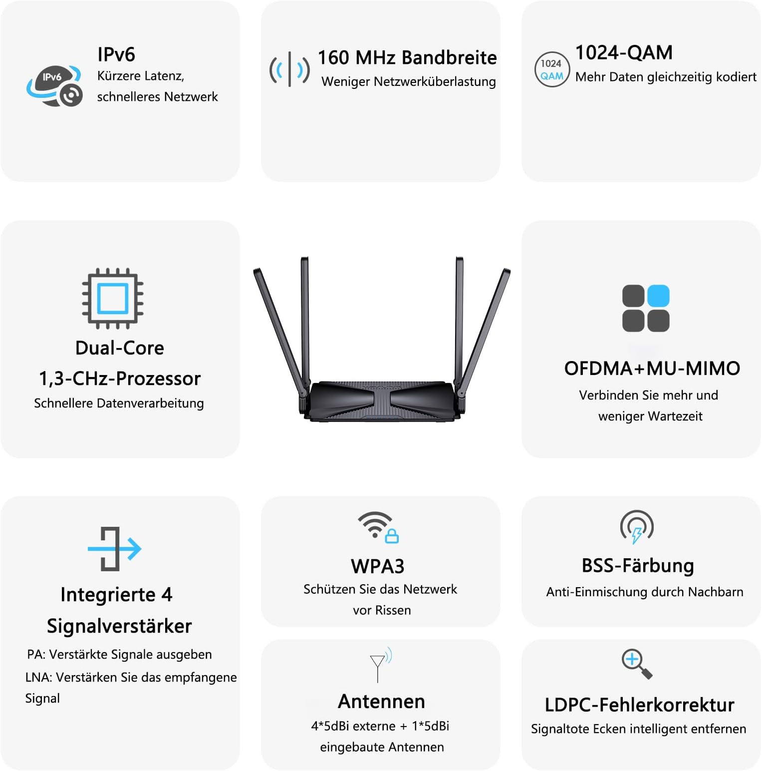 - WiFi 6 tehnologija (802.11ax) – Najnovejši standard za hitrejšo in stabilnejšo povezavo s povečano zmogljivostjo omrežja