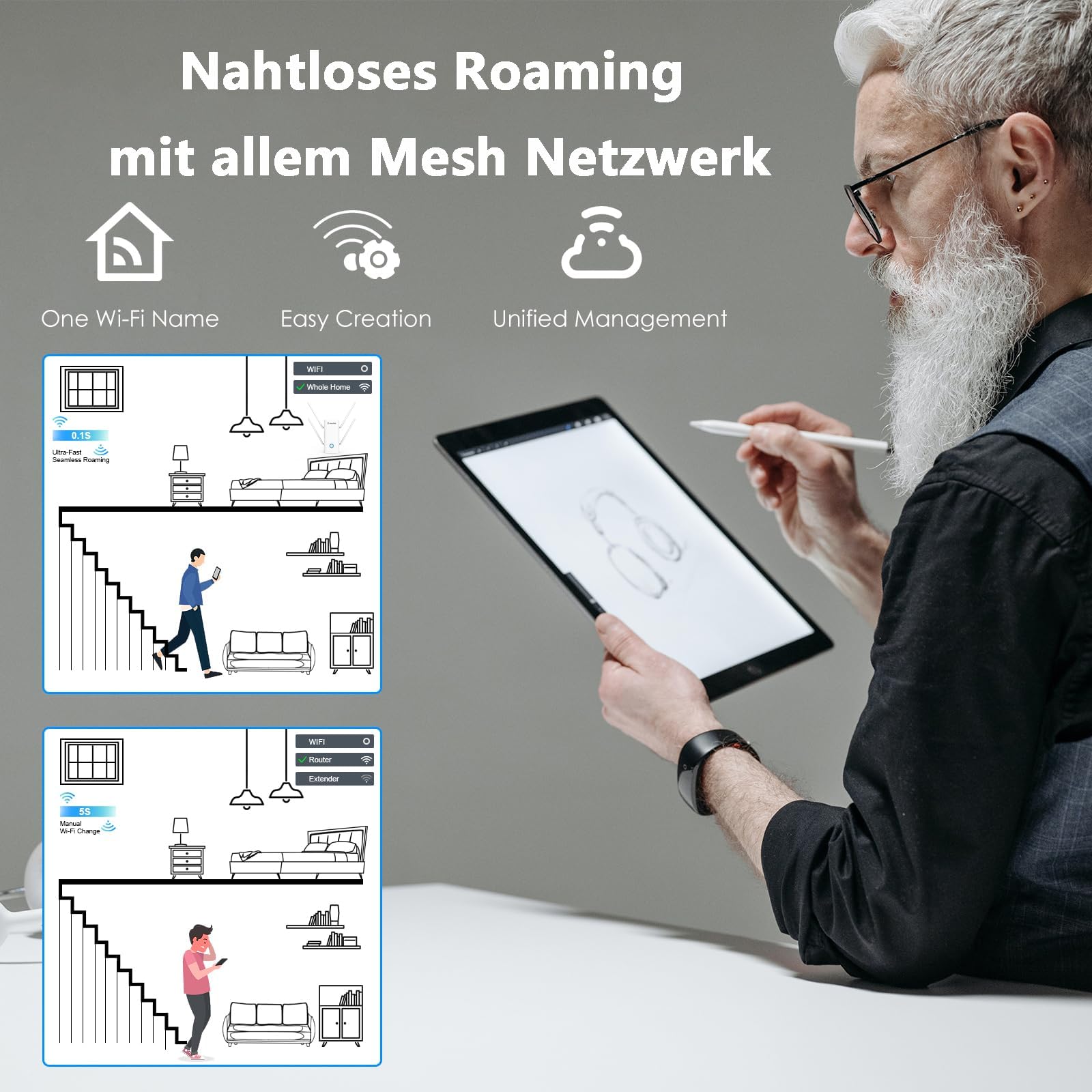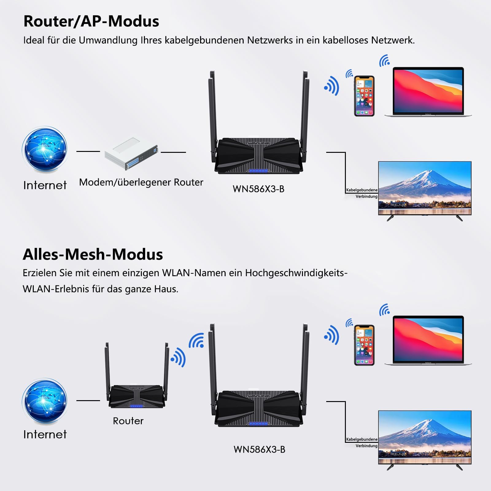 - Mesh omrežje – Dodajte druge WAVLINK mesh naprave in ustvarite eno samo omrežje z enakim imenom – brez ročnega preklapljanja med povezavami