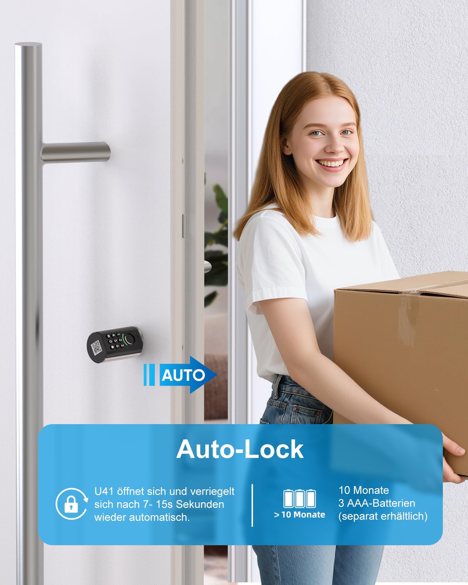 • Pametna aplikacija za iOS in Android: Upravljajte vrata od kjerkoli — odklepanje, zapiranje, deljenje dostopa in pregled zgodovine dostopov